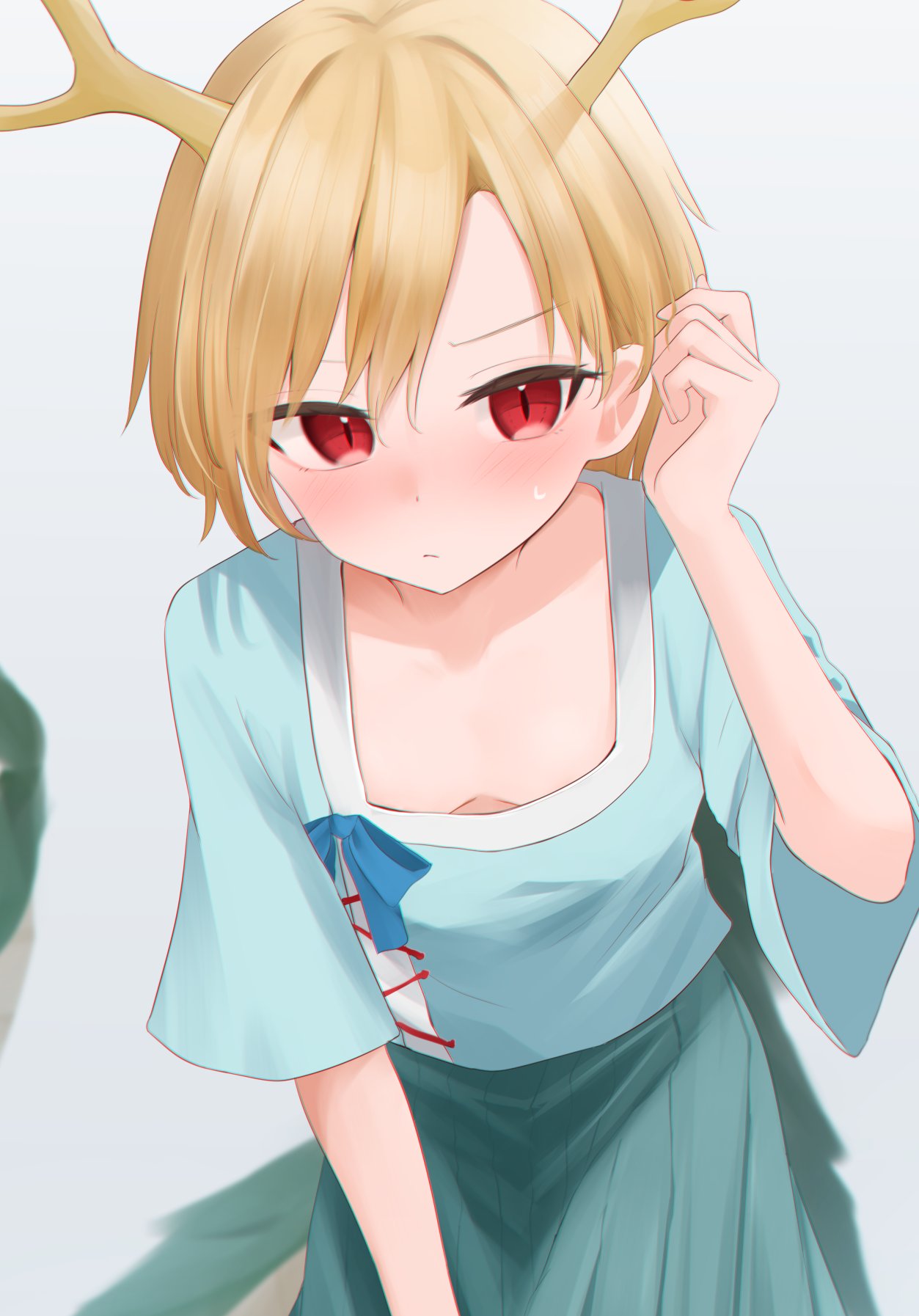 1girlblonde hairblue shirtblushbreastsclosed mouthdragon girldragon hornsdragon tailgreen scalesgreen skirthornsleaning forwardlooking at viewerred eyesshirtshort sleevesskirtsmall breastssolosquare necklinesweatdroptailyellow horns
