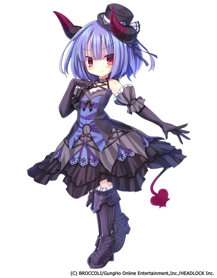 1girlarmored bootsblack dressblack glovesblack hatblack hornsblue dressblue hairbootsbreastscompany namecopyright noticedresselbow glovesglovesgradient hornshatheartheart tailhornsjabberwock (eco)multicolored hornspurple bootsred eyesred hornssleevelesssleeveless dresssmall breastssolotailtwo-tone dresswhite background