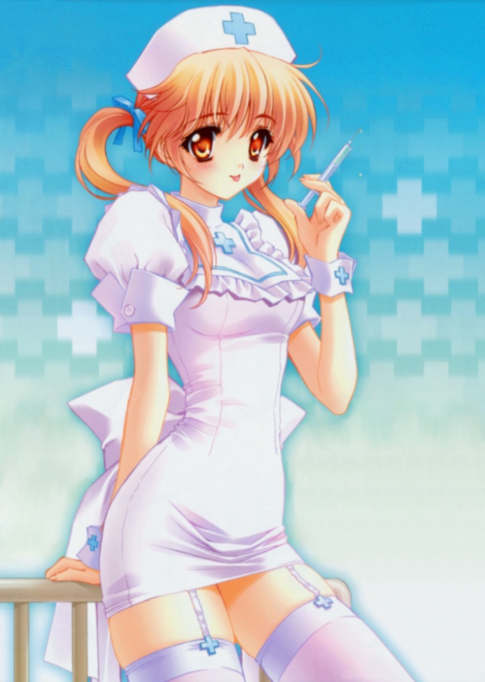 :pblonde hairbowgarter belthair bowlong hairnurseorange eyesorange hairsolosyringethighhighstonguetongue outtwintailswrist cuffsyellow eyeszettai ryouiki