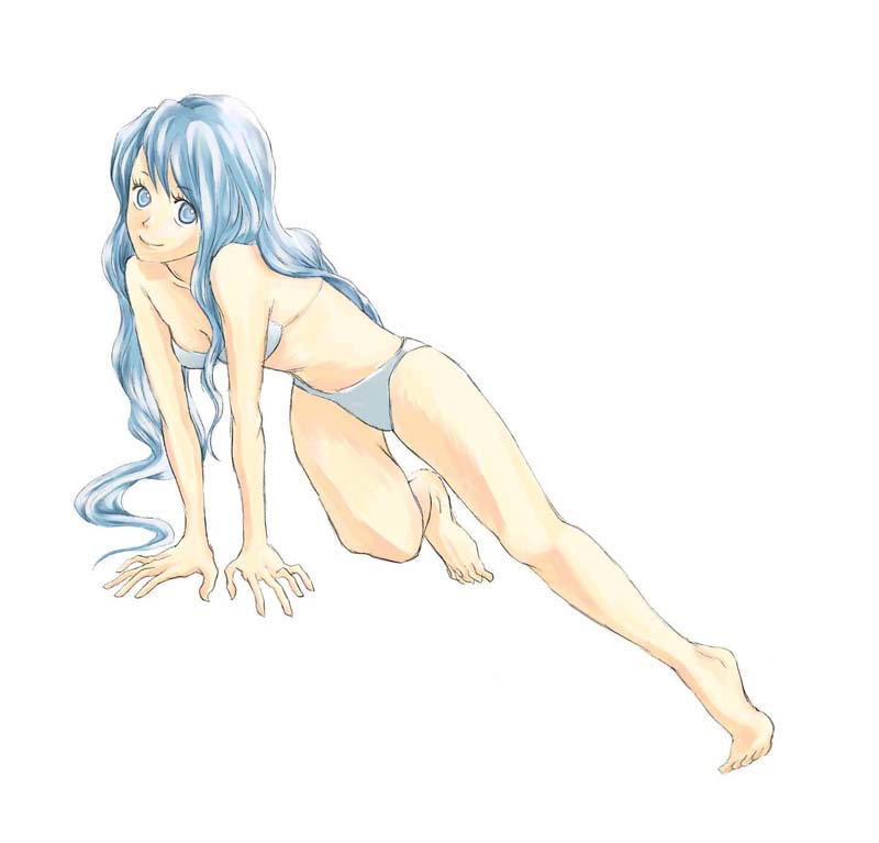 ryoji (nomura ryouji), mugen no fantasia, lowres, 1girl, blue eyes, blue hair, blush, breasts, cleavage, female focus, huge breasts, matching hair/eyes, open mouth, ponytail, solo, swimsuit, water