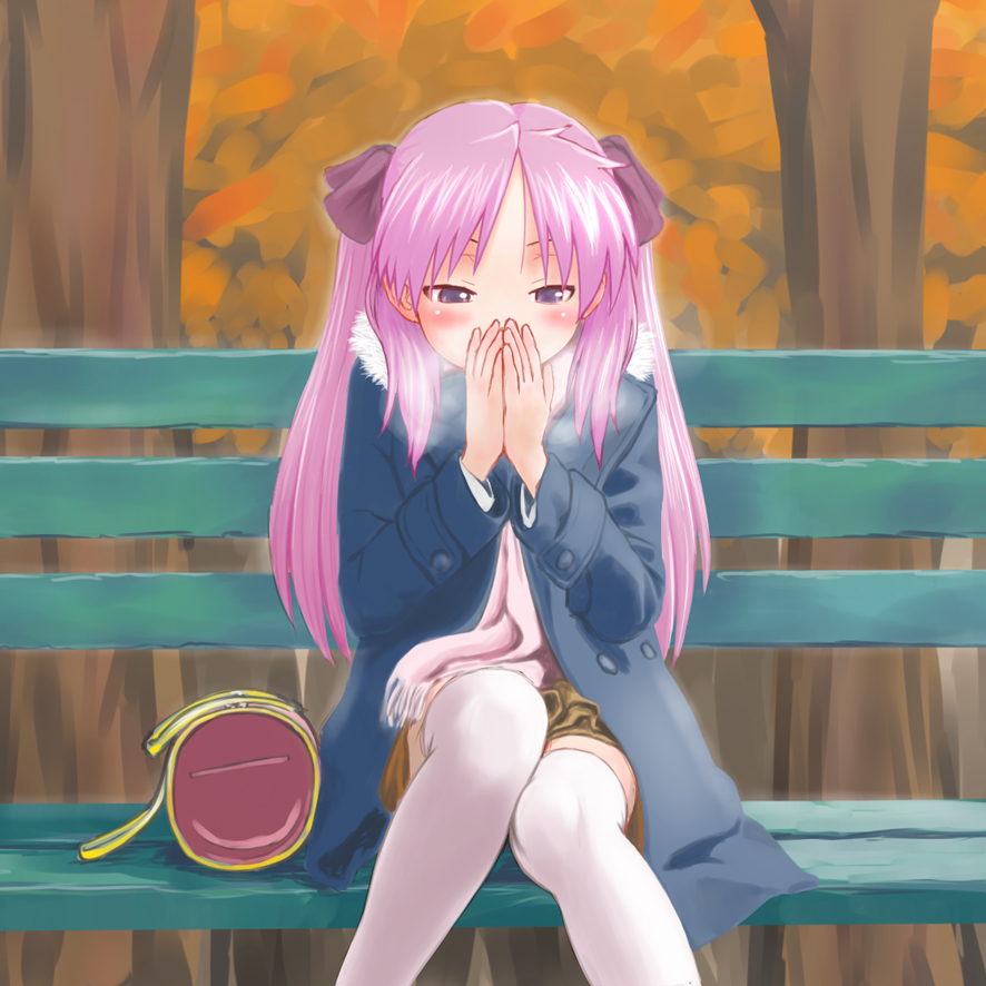 00s1girlbagbenchbreathcoatfemale focuslong hairpink hairpurple eyesscarfsittingsolothighhighstreetwintails