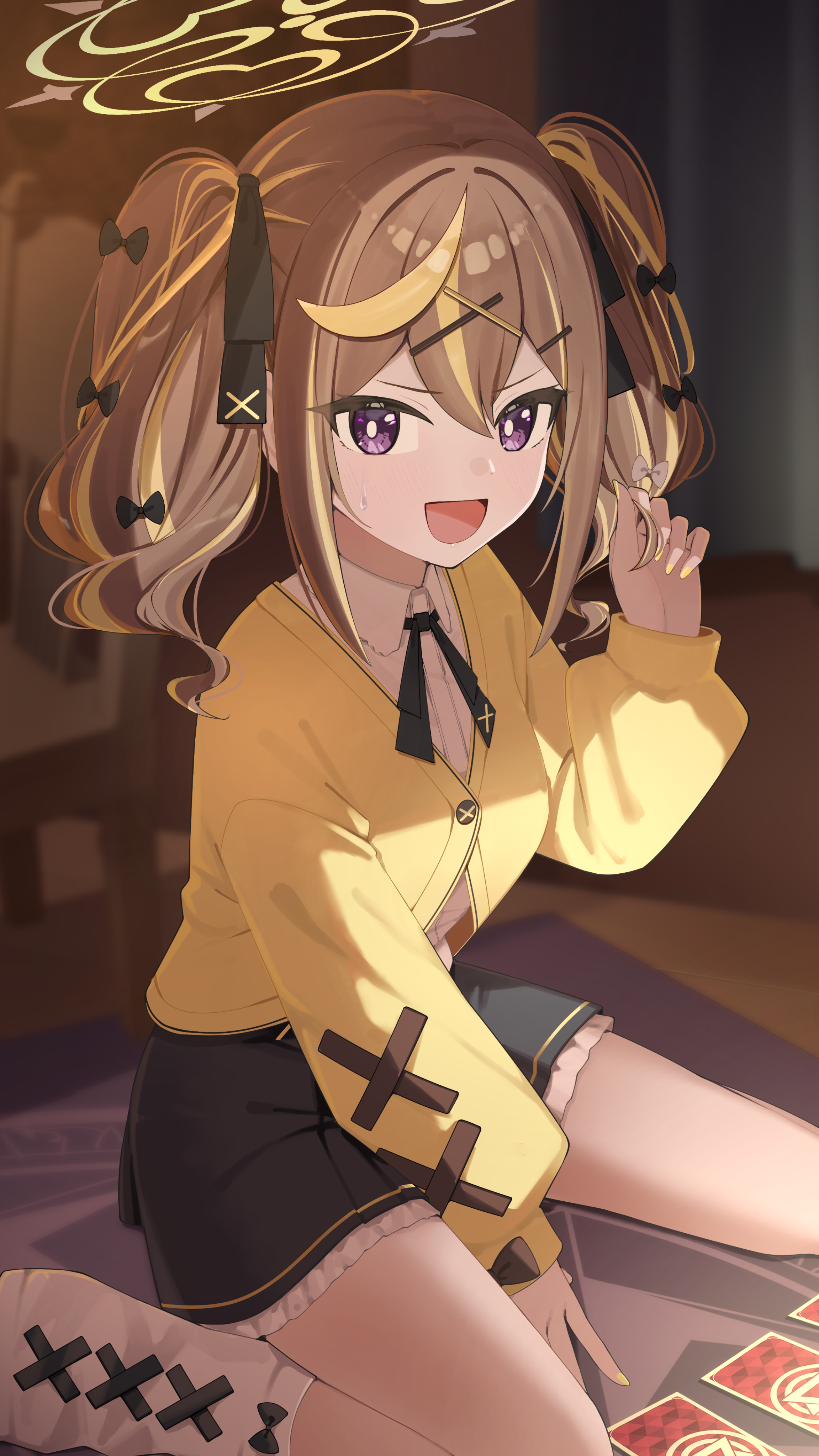 yuasa akira, z/x, official art, ahoge, black shoes, black thighhighs, blue dress, bow, bowtie, breasts, brown hair, concert, copyright notice, dress, frilled dress, frilled skirt, frills, hair ornament, holding, holding microphone, large breasts, long hair, microphone, multicolored dress, night, night sky, outdoors, plaid bow, plaid bowtie, plaid clothes, plaid skirt, prism (z/x), red dress, shoes, skirt, sky, sparkle, splashing, standing, standing on one leg, star (sky), thighhighs, very long hair, white dress