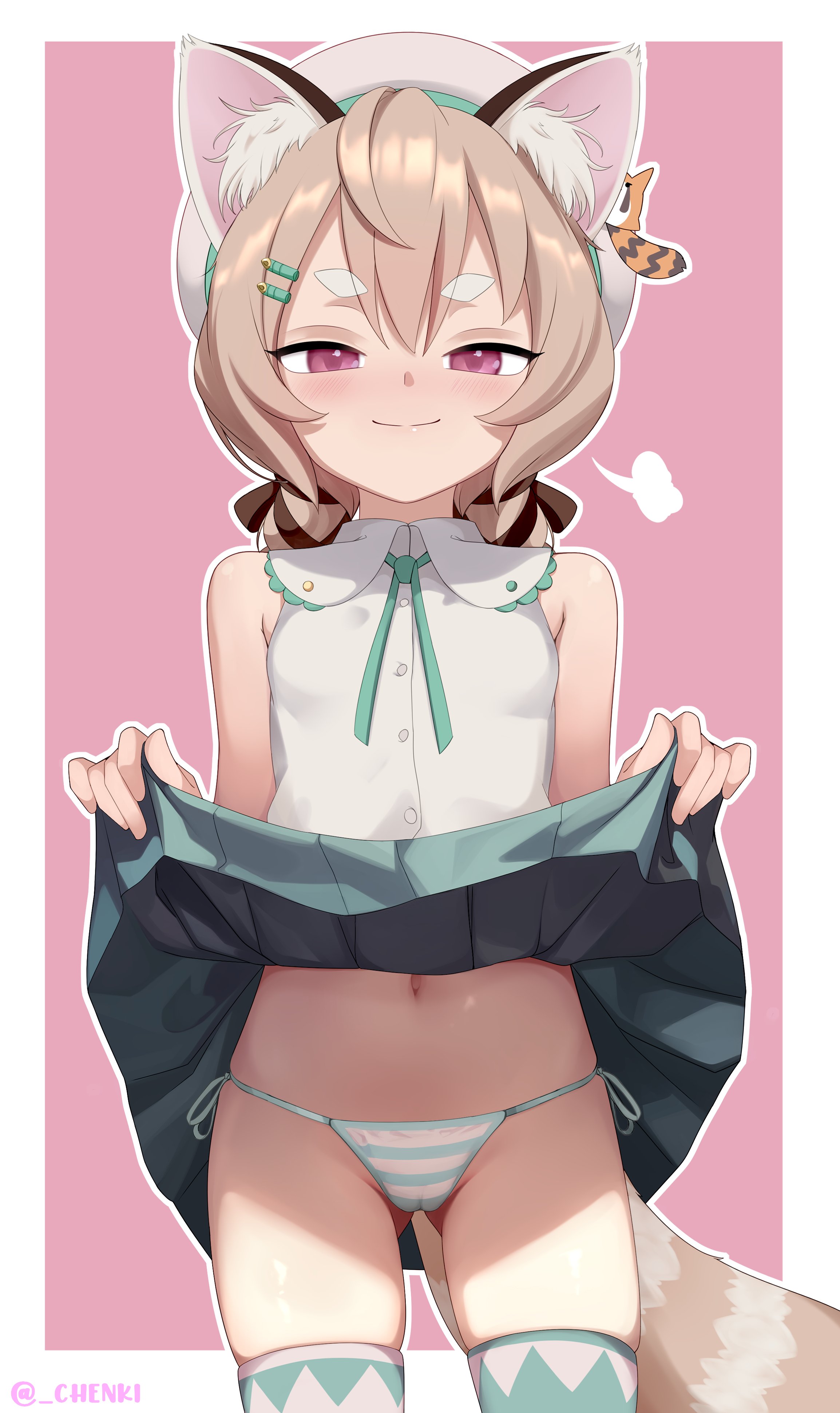 1girlanimal ear fluffberetblushborderbreastsbrown hairbrown ribboncameltoeclosed mouthclothes liftcowboy shotgluteal foldgreen ribbongreen skirthair between eyeshair ornamenthair ribbonhaircliphatlifting own clotheslooking at viewernavelneck ribbonoutside borderpantiespink backgroundpink eyespleated skirtpuff of airred panda earsred panda girlred panda tailribbonshirtshort eyebrowsside-tie pantiesskirtskirt liftsleevelesssleeveless shirtsmall breastssmilesolostandingstring pantiesstriped clothesstriped pantiesthick eyebrowsthighhighsunderwearvirtual youtuberwhite borderwhite hatwhite shirt