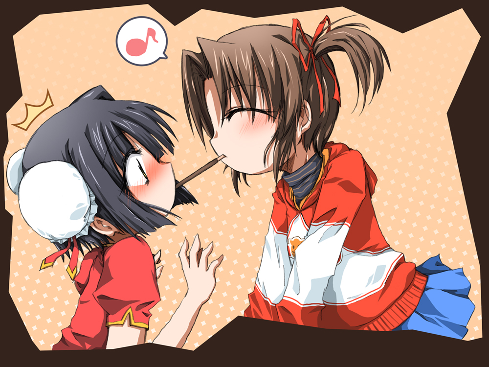 10sblack hairblushbrown hairbun coverchinese clothesdouble bunpockypocky kissshared foodshort hairtwintails