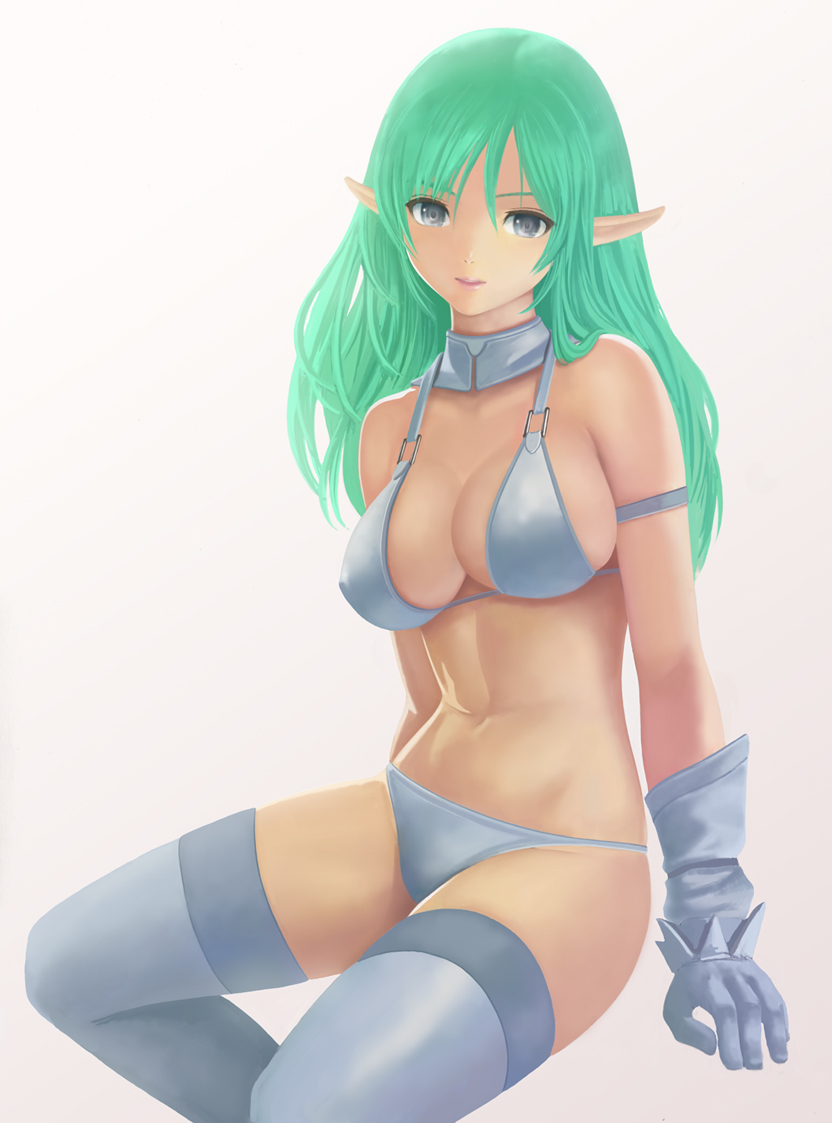 1girlarmorbikini armorblue eyesbreastscleavagefemale focusglovesgreen hairlarge breastslong hairlooking at viewernavelo-ringo-ring topparted lipspointy earssittingskindentationsmilesolothighhighs