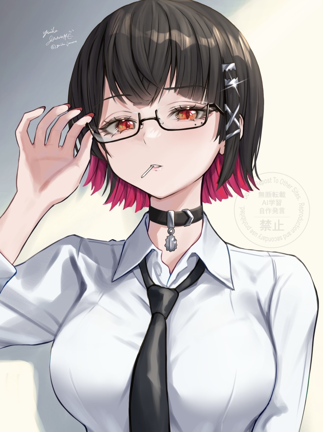 1girlblack chokerblack hairblack necktieblack-framed eyewearbreastschokercollared shirtcolored inner hairglasseslarge breastslooking at viewermolemole under eyemulticolored hairnail polishnecktieopen mouthred eyesred hairred nailsshirtshort hairsoloupper bodywatermarkwhite shirt