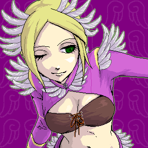 1girlblonde hairbreastscleavagefeathersfemale focusgreen eyesmedium breastsoekakione eye closedsmilesolowink