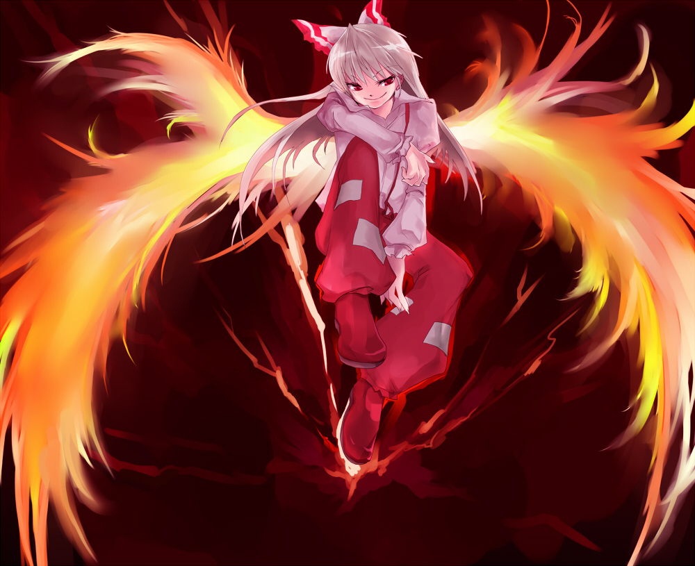 1girlbowfemale focusfiery wingshair bowlong hairpantsred eyesshirtsmilesolovery long hairwhite hairwhite shirtwings