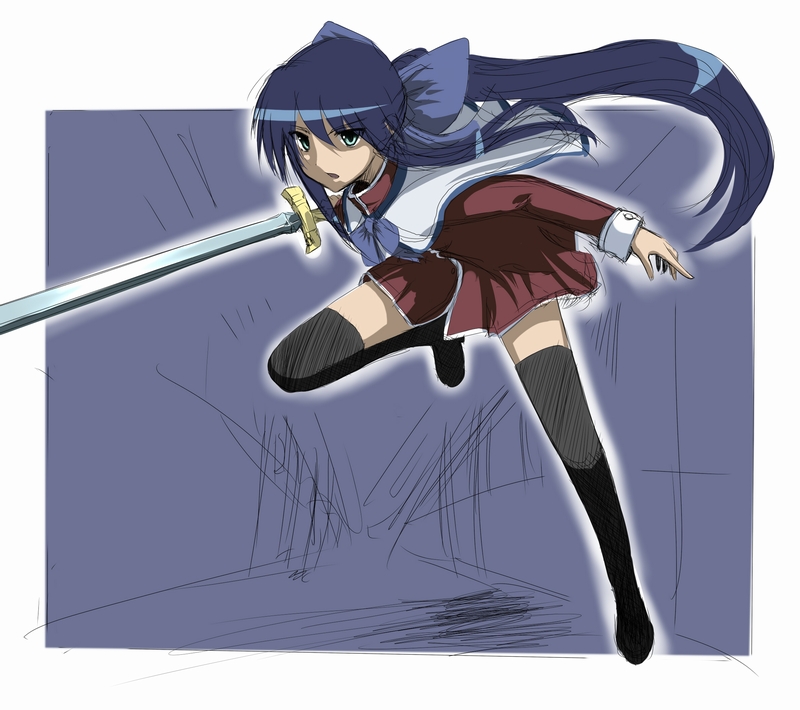 1girlfemale focuslong hairponytailred skirtschool uniformskirtsoloswordthighhighsvery long hairweaponzettai ryouiki