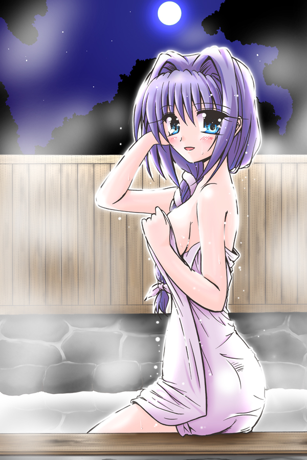 1girlbathblue eyesbraidbreastsfemale focushair intakesmature femalemoonnaked towelpurple hairsideboobsmall breastssolosteamtowel