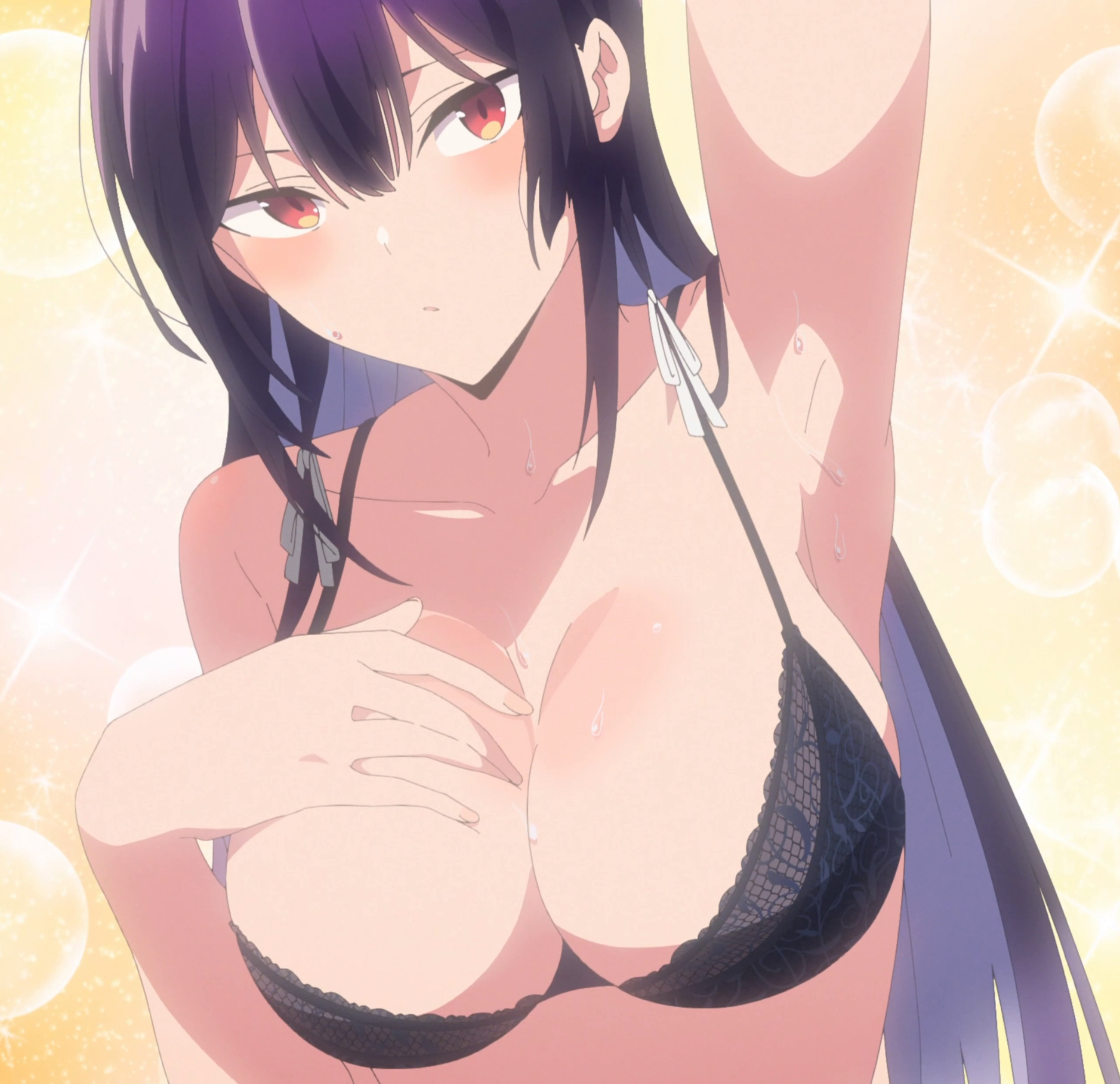 1girlarm uparmpitsblack brablushbrabreastsclosed mouthcollarbonecolored inner hairfemale focushair ribbonlarge breastslong hairlooking at viewermulticolored hairportraitpurple hairribbonsolosweattwo-tone hairunderwearvery long hairwhite ribbon