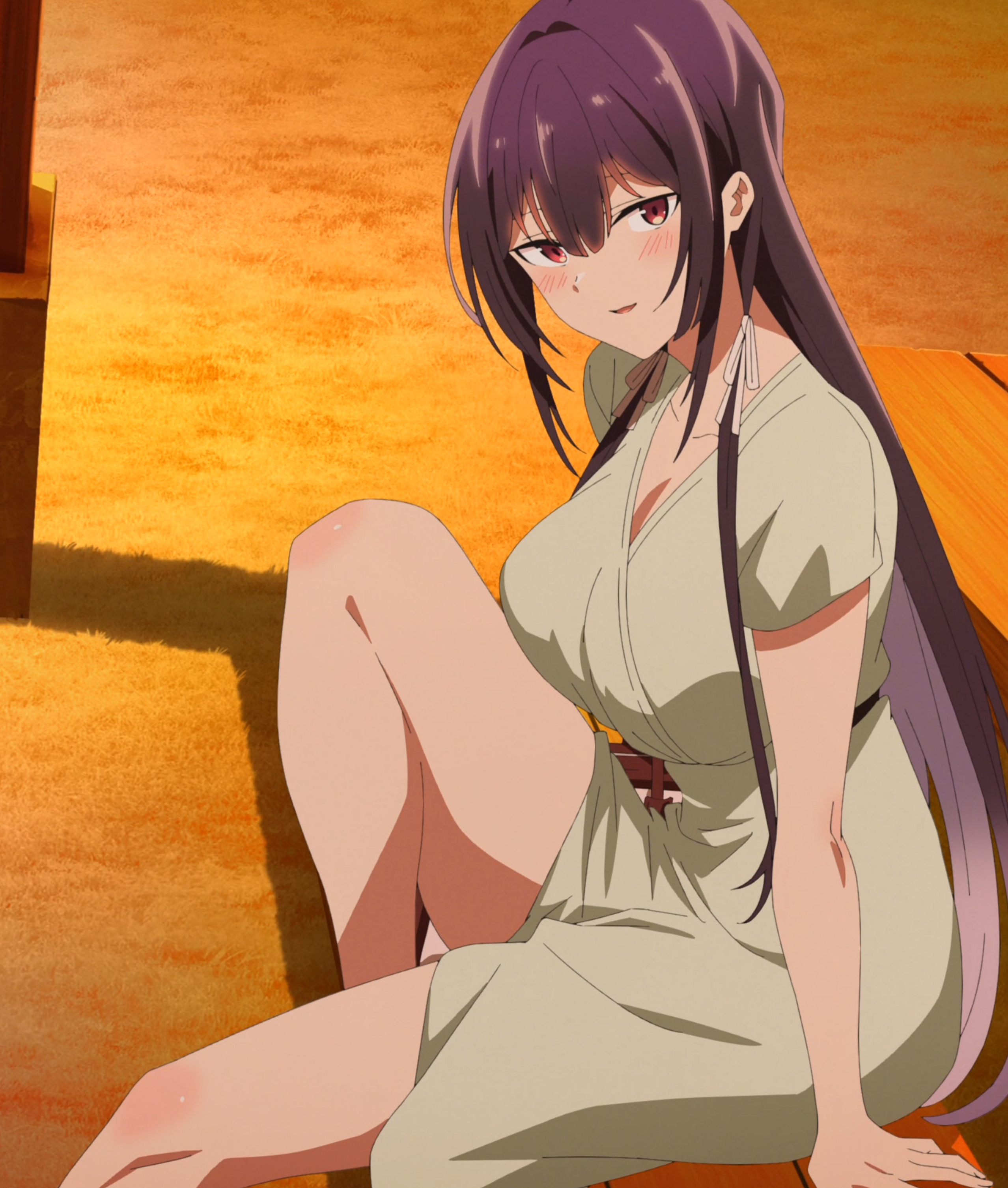 1girlarm supportbare legsbreastscolored inner hairdressfemale focushair ribbonknee uplarge breastslong hairlooking at viewermulticolored hairoutdoorsparted lipspurple hairred eyesribbonshort sleevessittingsmilesolothighstwo-tone hairvery long hairwhite dresswhite ribbon