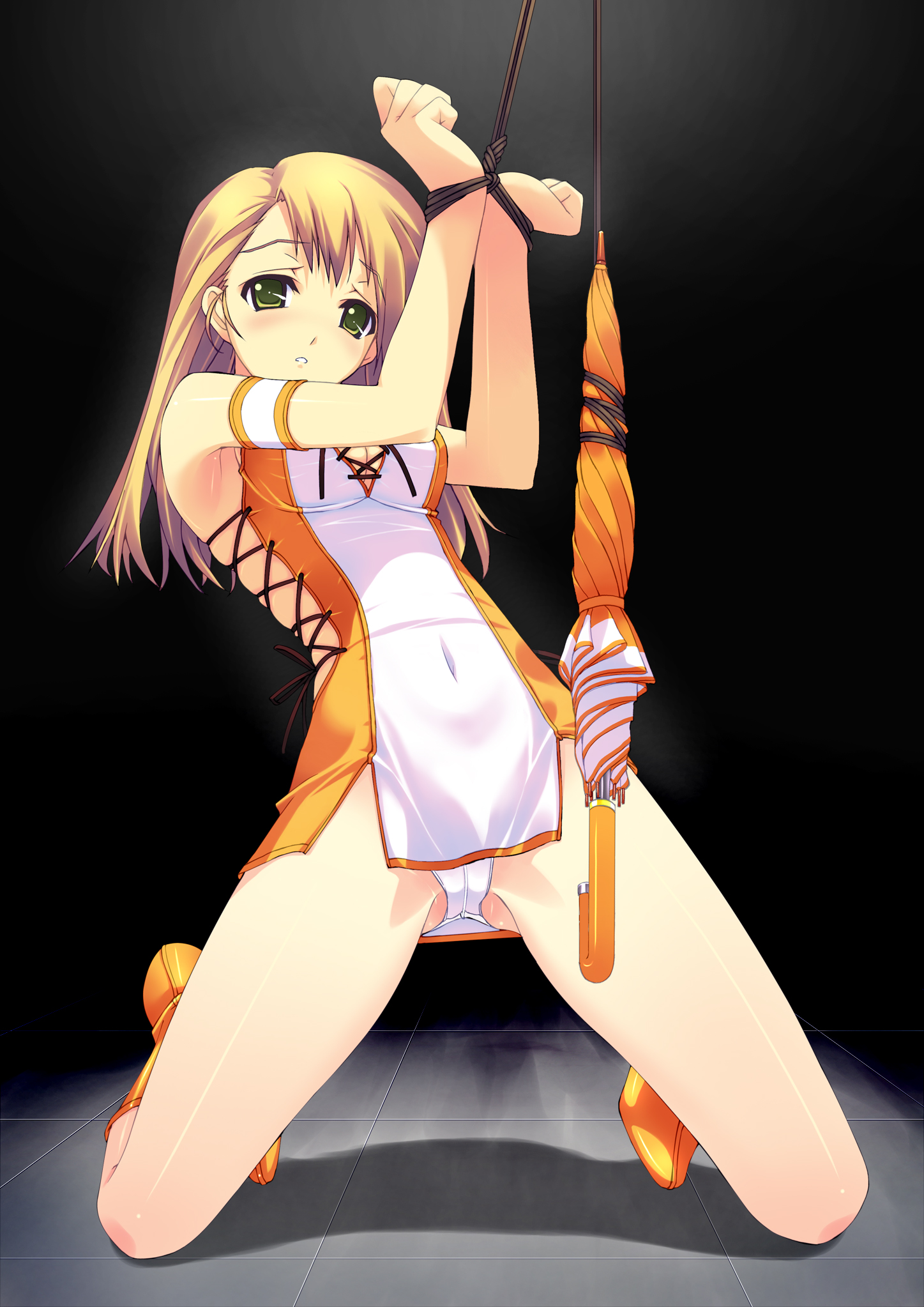 1girlarmbandbare shouldersbdsmblonde hairblushbondagebootsboundbound wristscovered navelcross-laced clothesdressfemale focusfloorgreen eyeskneelinglong hairlooking at viewermicrodressno braon floororange bootspantiesparted lipsrace queenropeshadowshiny skinsleevelesssleeveless dresssolospread legsthighsumbrellaunderwearupskirtwhite panties