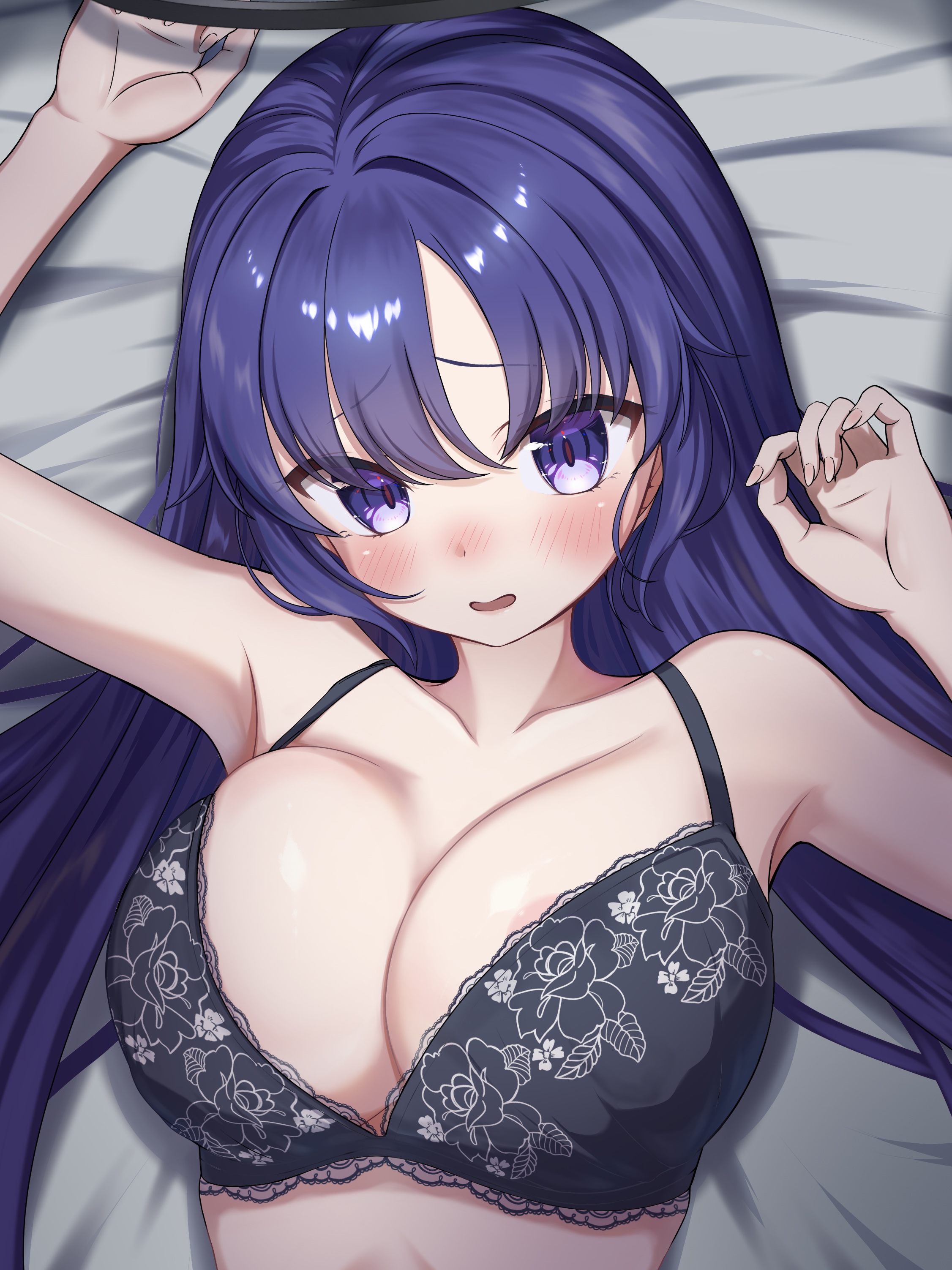 1girlareola sliparmpitsbed sheetblack brablushbrabreastscollarboneembroidered brahalolacelace trimlace-trimmed bralarge breastslong hairlooking at viewerlyingon backpurple eyespurple hairsolounderwearunderwear onlyupper bodyvery long hair