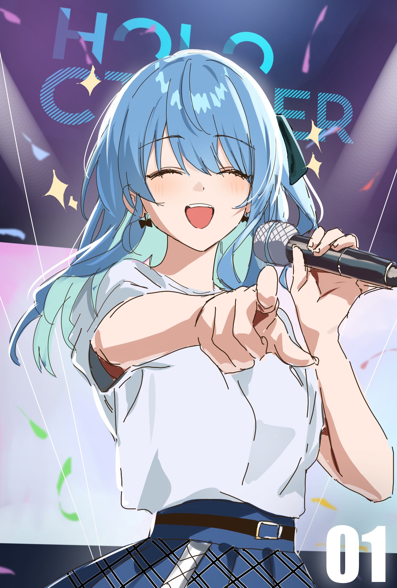 1girlblue hairblushconfettihair between eyeslong hairmicrophonemusicsingingsolosparklevirtual youtuber