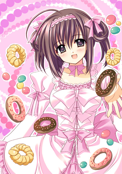 1girlblushbrown haircandydonutdressfemale focusfoodfrillshairbandlolita fashionmacaronopen mouthpastrypink dresspurple eyesribbonsmilesolosweetstwintails
