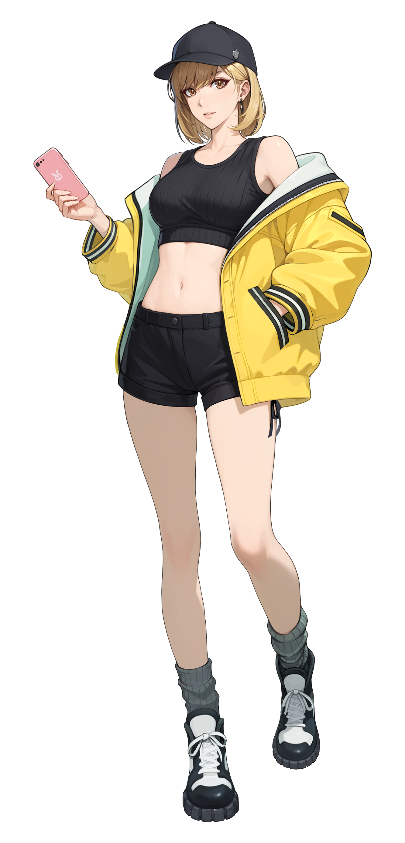 1girlbaseball capblack hatblack shoesblack shortsblack sports brablonde hairbreastsbrown eyescellphonefull bodygrey sockshand in pockethatholdingholding phonejacketmedium breastsmidriffnavelofficial alternate costumeopen clothesopen jacketphoneshoesshort shortsshortssimple backgroundsmartphonesockssolosports bratransparent backgroundyellow jacket