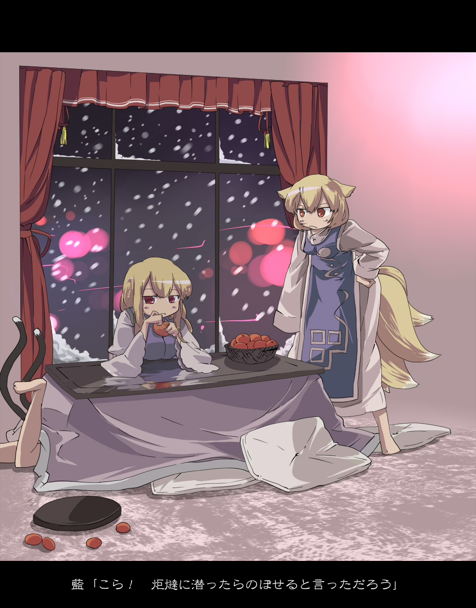3girlsbarefootblonde haircurtainsfeetfemale focusfoodfruithand on own hipindoorskotatsuletterboxedmandarin orangemultiple girlsmultiple tailsno headwearorange eyespillowred eyessnowsnowingtabletailunder kotatsuunder tablewindow