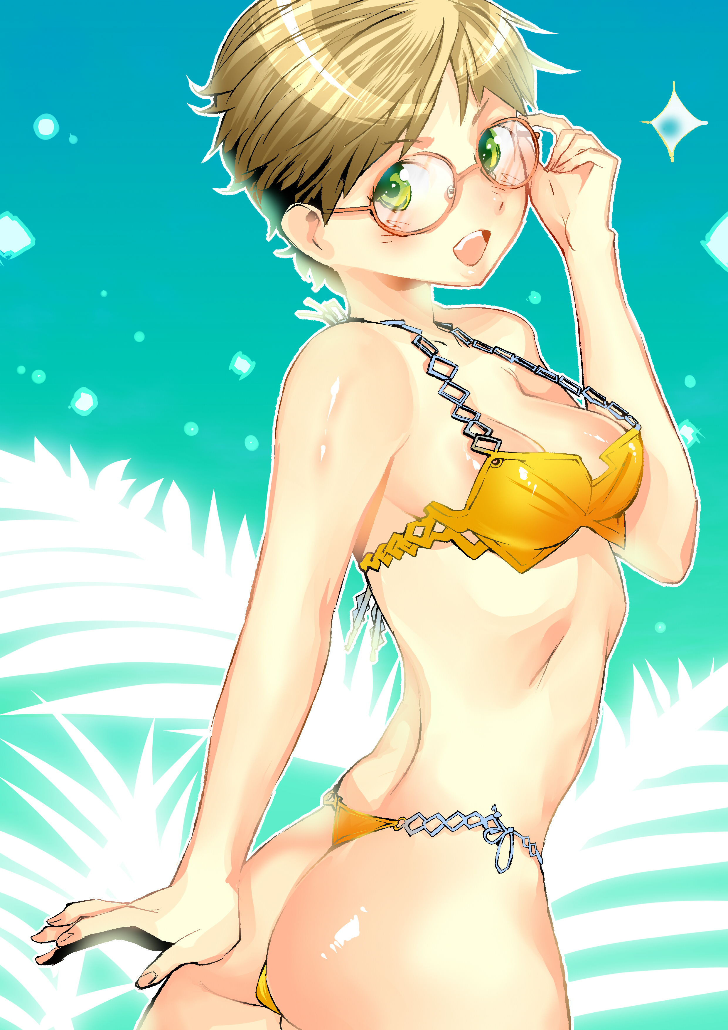 1girlassbikiniblonde hairfemale focusglassesgreen eyesshort hairsoloswimsuitthong bikiniyellow bikini