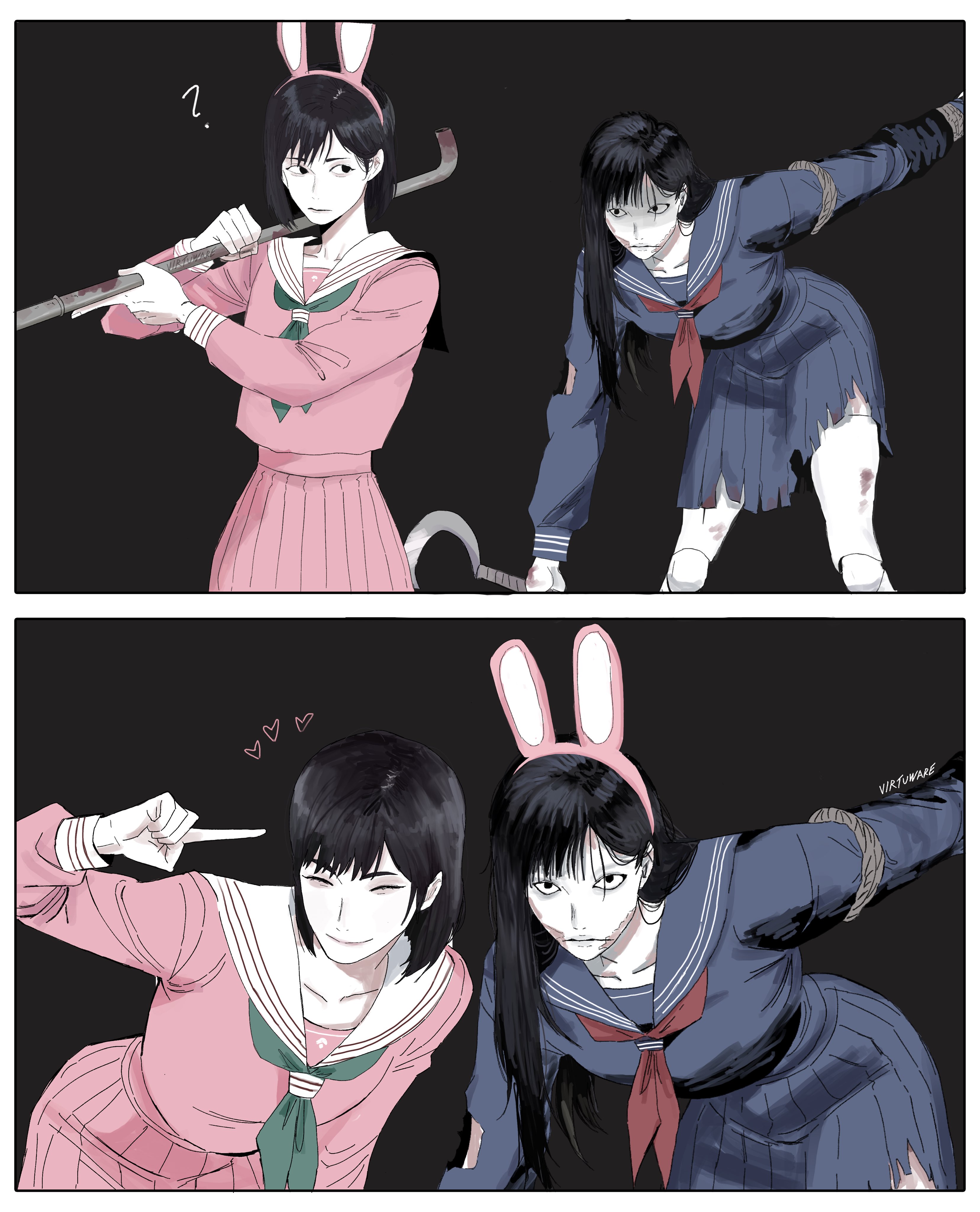 2girlsblack hairblack sailor collarblack sclerablack serafukucolored scleraholdingholding lead pipelead pipemultiple girlsneckerchiefpink serafukured neckerchiefsailor collarschool uniformserafukushimizu hinako (pink rabbit costume)smile