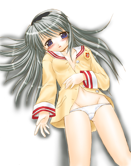 00s1girlblushbottomlessfemale focushairbandlong hairno braopen clothesopen shirtpantiesschool uniformshirtsolounderwearwhite panties
