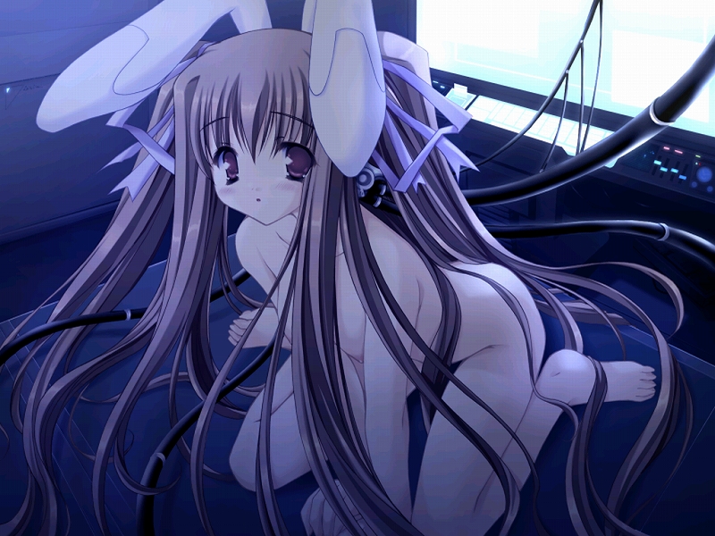 1girlandroidanimal earsbarefootblushbreastsbrown haircablecensoredconvenient censoringfeetfemale focusflat chesthair ribbonkneelinglong hairnipplesnudeopen mouthrabbit earsred eyesribbonrobotsittingsolotwintailsvery long hair