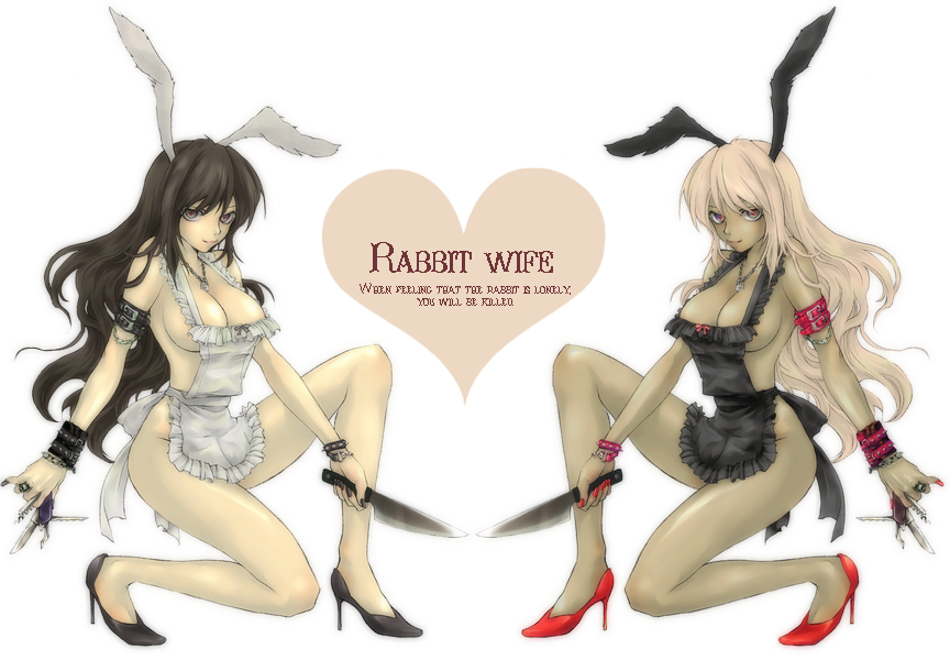 2girlsanimal earsaprondark skindark-skinned femaleenglish textengrish texthigh heelsjewelryknifelong hairmultiple girlsnaked apronnecklacepale skinrabbit earsranguageshoesswiss knifeyandere