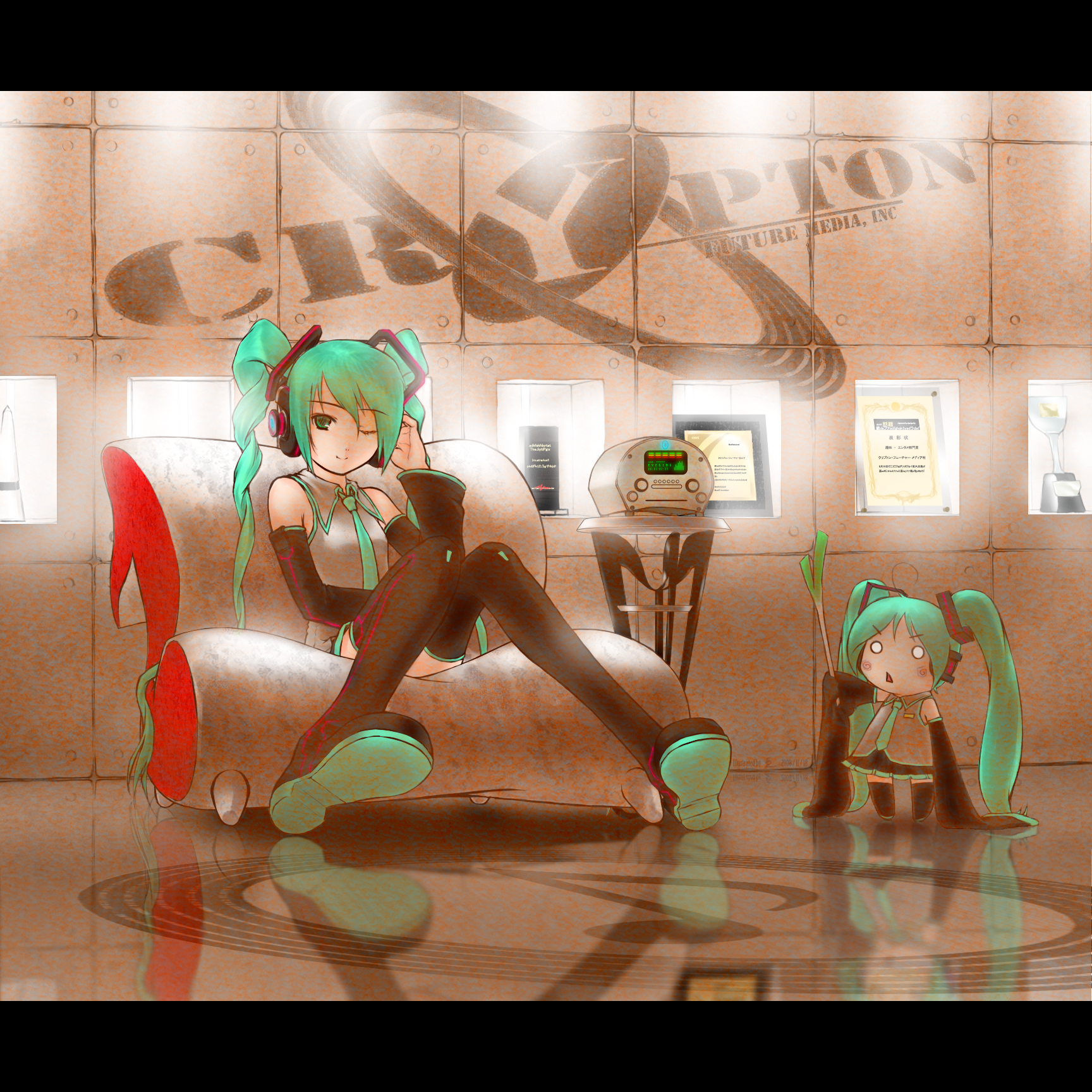 aqua hairchibidetached sleevesgreen eyesheadphoneslegslong hairnecktieone eye closedreflectionsittingskirtspring onionthighhighstwintailswinkzettai ryouiki