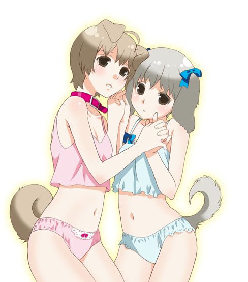 2girlsanimal earsblue pantiesbrown eyesbrown haircamisolecollardog earsdog tailholding handsinterlocked fingerslingeriemultiple girlspantiespink pantiesshort hairtailunderwear