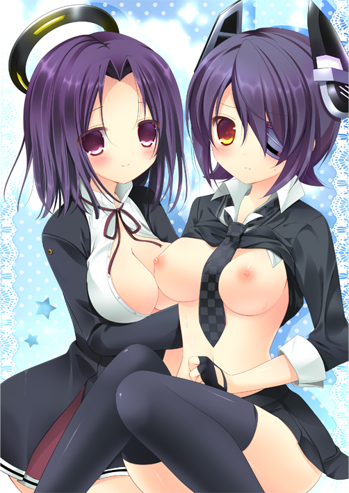 2girlsbetween breastsblushbreastscheckered necktieeye patchfingerless glovesFlag for Deletionglovesheadgearmechanical halomultiple girlsnecktienecktie between breastsnipplesopen clothesopen shirtpersonificationpurple eyespurple hairschool uniformshort hairskirtsmilethighhighsyellow eyes