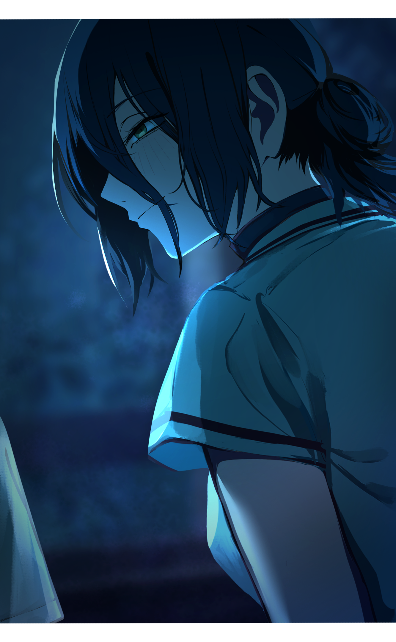 1641 (chfhrtor94), alice margatroid, alice margatroid (pc-98), touhou, touhou (pc-98), absurdres, commentary, highres, 1girl, back bow, blonde hair, blue bow, blue hairband, bound, bound wrists, bow, bow hairband, cowboy shot, crying, crying with eyes open, from behind, gag, gagged, gibberish commentary, hair bow, hairband, improvised gag, looking at viewer, looking back, puffy short sleeves, puffy sleeves, shirt, short hair, short sleeves, simple background, skirt, solo, suspender skirt, suspenders, tape, tape gag, tears, white background, white shirt, yellow eyes