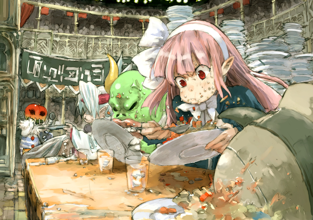1girlcolored skincompetitiondrinkeatingfoodfood on facegreen skinhornspink hairplatepointy earsred eyeswhite hair