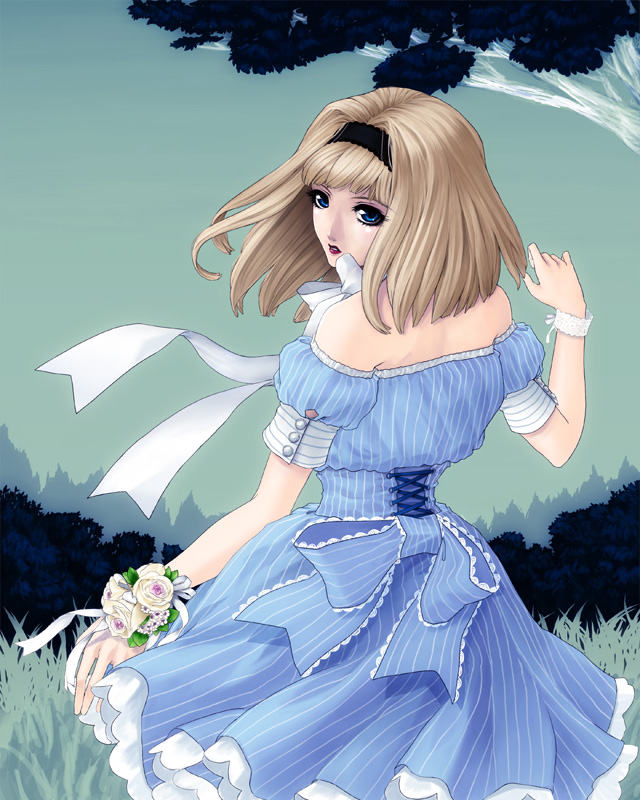 1girlblonde hairblue eyesbowdressfemale focusflowerfrillshairbandlipsticklooking backmakeupnightribbonshort hairsolo