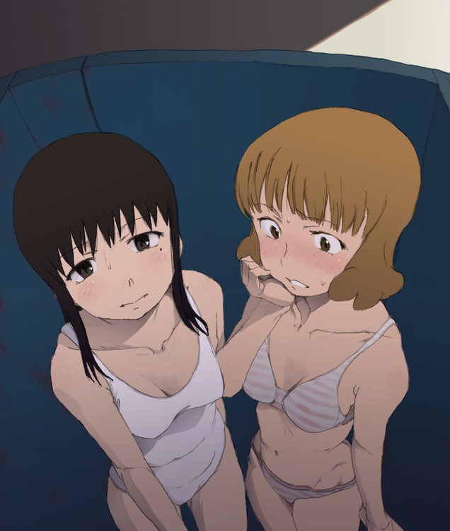 bikiniblack hairbrown hairfrom abovemolemole under eyeone-piece swimsuitstriped bikinistriped clothesswimsuitwhite one-piece swimsuit