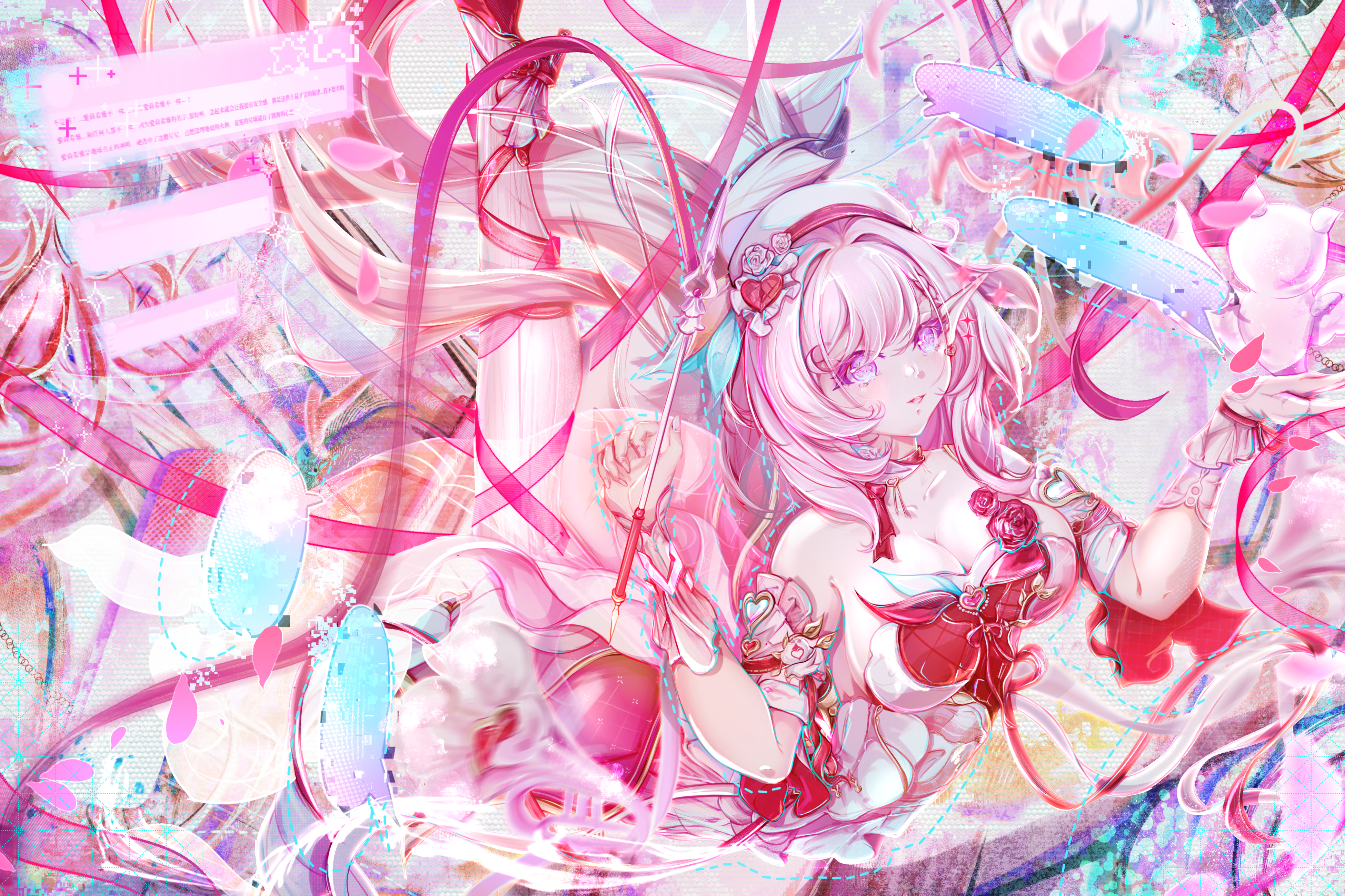 1girlbare shouldersberetbreastscleavagediamond (shape)diamond-shaped pupilsdresselfhathigh heelsholdingholding wandlarge breastslong hairpink hairpointy earspurple eyesred dresssolosymbol-shaped pupilstwo-tone dressvery long hairwandwhite dress