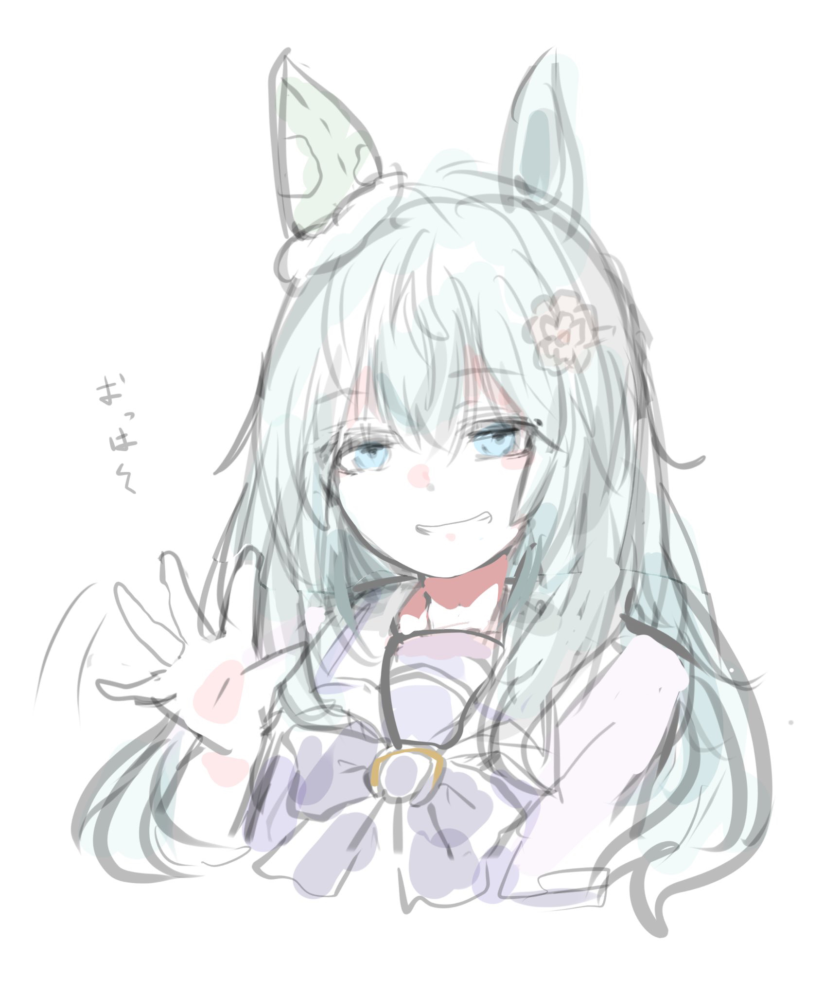 1girlanimal earsblue eyesbowcropped torsoflowergrey hairgrinhair between eyeshair flowerhair ornamenthaircliphand uphorse earslong hairlooking at viewerpuffy short sleevespuffy sleevespurple bowpurple shirtschool uniformshirtshort sleevessimple backgroundsketchsmilesolotracen school uniformupper bodywavingwhite backgroundyellow flower