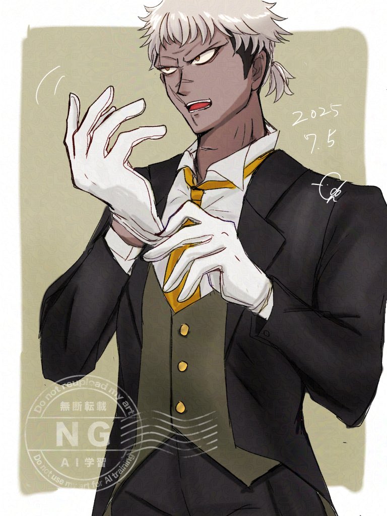 1boydark skindark-skinned maleformal clothesfulattecocoglovesjacketmale focusponytailputting on glovesscarscar on faceshort hairshort ponytailsimple backgroundsuit jacketwhite gloveswhite hair