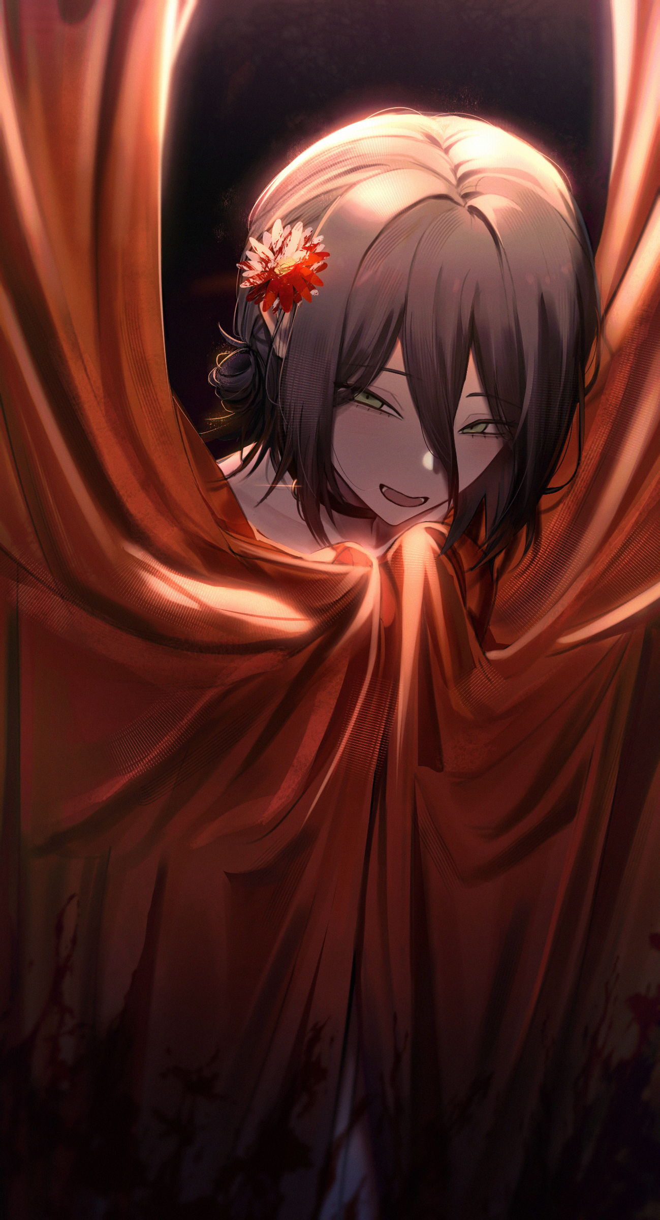 1girlblack chokerblack hairblood on curtainschokercurtain grabcurtainsflowergreen eyeshair between eyeshair flowerhair ornamentlooking at vieweropen mouthred flowersolo