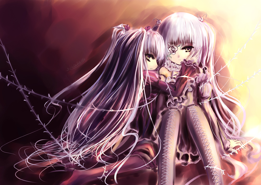 00s2girlsbootsdresseyepatchflowerfrillslong hairmultiple girlspink hairsittingthigh bootsthighhighstwintailstwo side upvery long hairyellow eyes