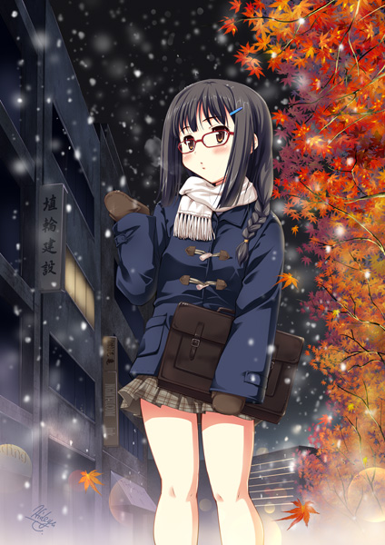 1girlautumn leavesbagblack hairbraidbrown eyescoatfemale focusglasseshair ornamenthairclipleaflegsmittensplaid clothesplaid skirtred-framed eyewearscarfschool bagskirtsnowsnowingsolostandingtoggleswinter clotheswinter coat