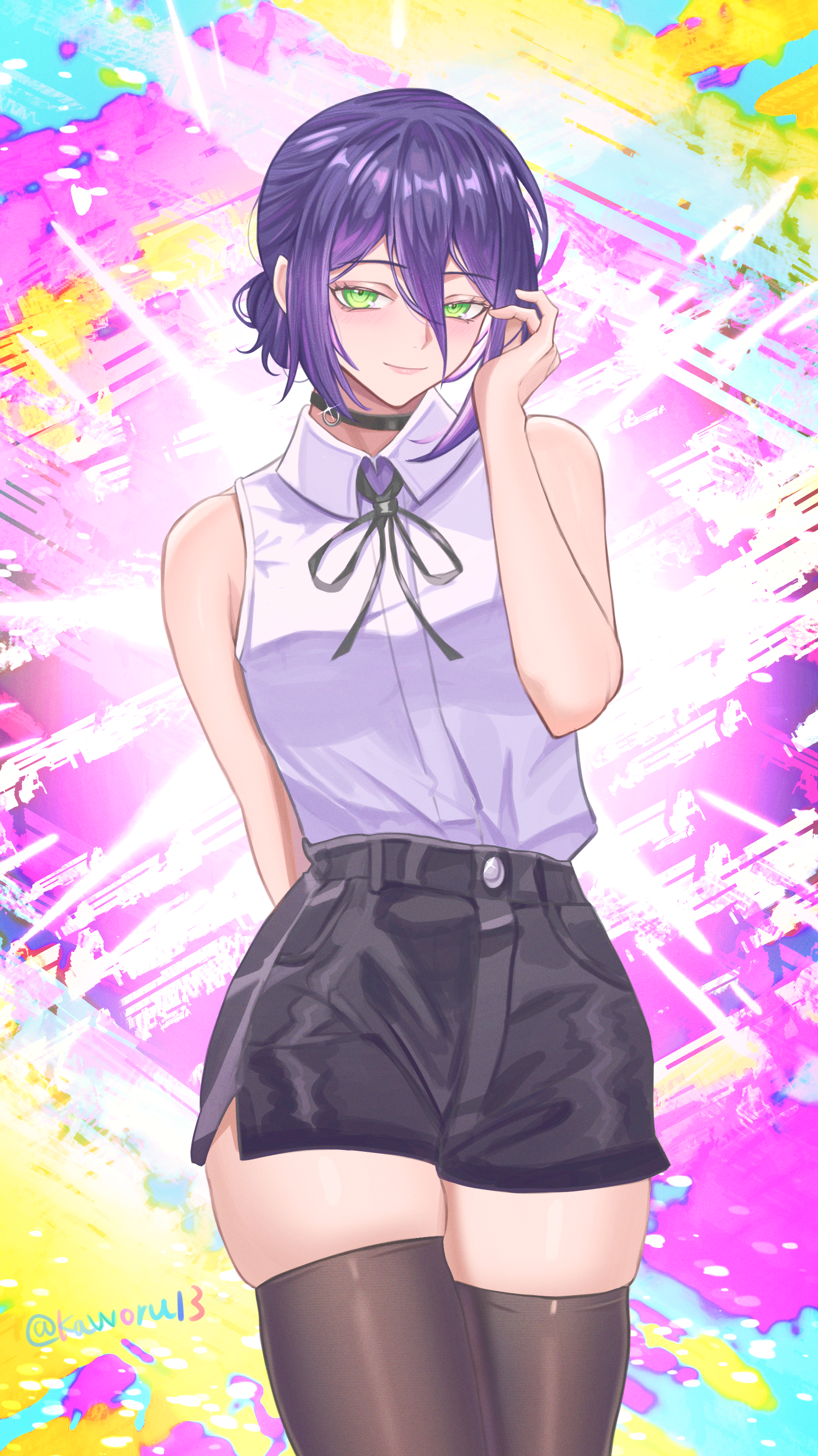 1girlarm behind backblack chokerblack ribbonblack shortsblack thighhighschokerclosed mouthcollared shirtgreen eyesgrenade pinhair between eyeshand upneck ribbonpurple hairribbonshirtshirt tucked inshort shortsshortssmilesolothighhighswhite shirt