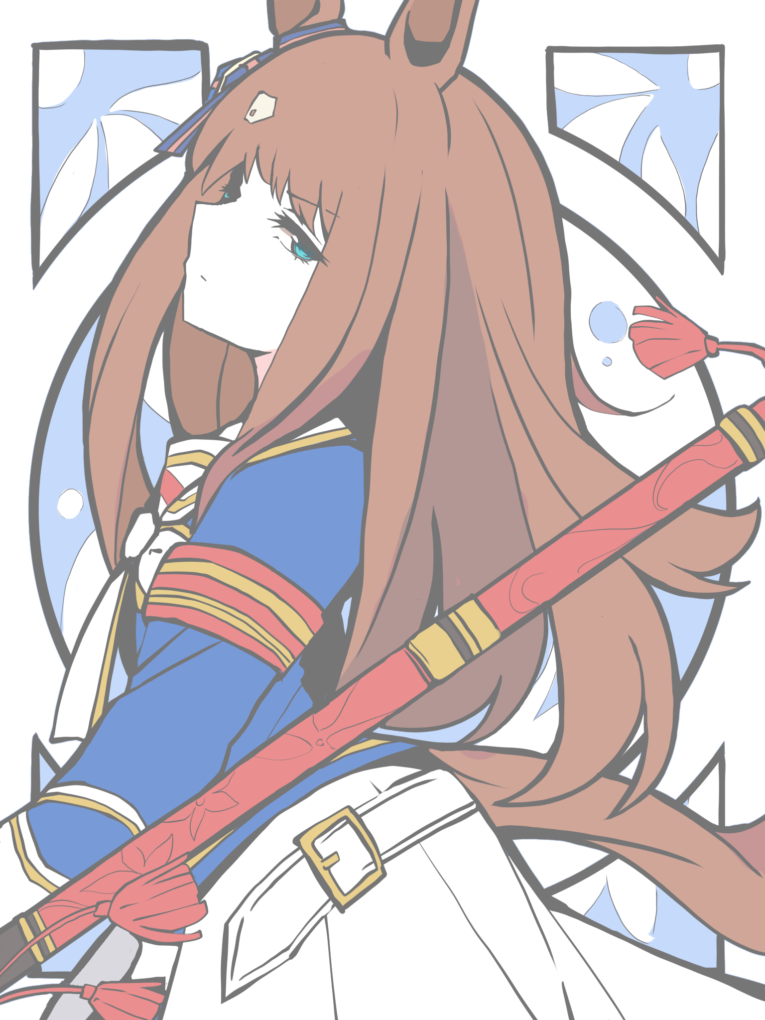 1girlanimal earsblue eyesblue shirtbrown hairclosed mouthfrom sidehorse earshorse girlhorse taillong hairlooking at viewerlooking to the sidemulticolored hairpleated skirtsailor collarshirtskirtsolotailtwo-tone hairvery long hairwhite hairwhite sailor collarwhite skirt