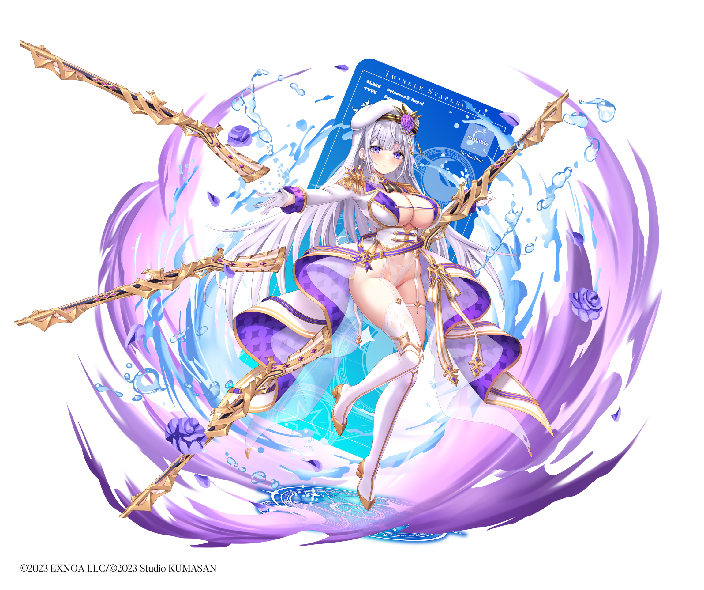 1girlberetbootsbreastsflowergarter strapsgunhathighleglarge breastslong hairlong sleevespurple eyespurple flowershino (twinkle star knights)thigh bootsweaponwhite hair
