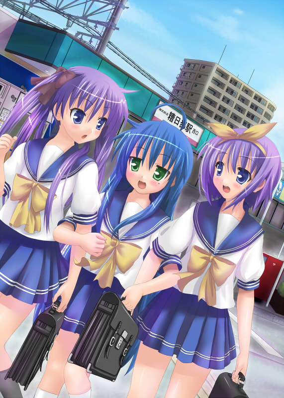 banakotakemaru, original, absurdres, commentary request, highres, 1boy, bag, blue sky, cloud, cloudy sky, holding, holding bag, long sleeves, outdoors, pants, railroad crossing, railroad tracks, road sign, scenery, shoes, short hair, sign, sky, solo, stop sign, sweater, traffic light, twilight