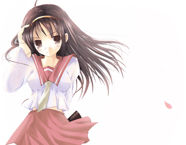 1girlahogeblack eyesblack hairfemale focusglasseshairbandhand on own headlong hairpetalsschool uniformserafukusolowind