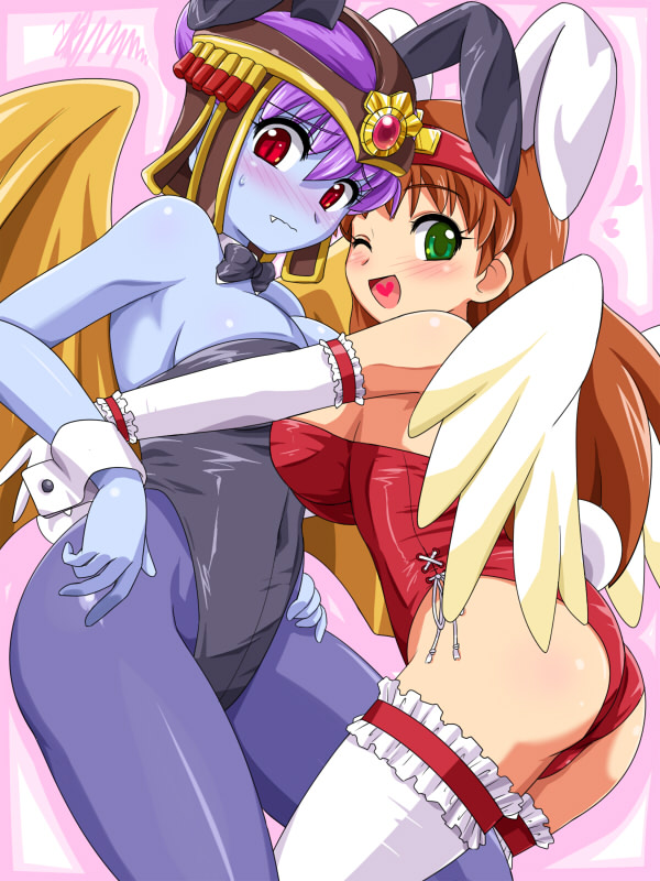 1girlangel wingsanimal earsassblue skinblushbreastsbrown haircolored skinelbow glovesfake animal earsfangglovesheartheart in mouthhuglarge breastslong hairmonster girlone eye closedpantyhoseplayboy bunnypurple hairrabbit earsrabbit tailred eyestailthighhighswingswink