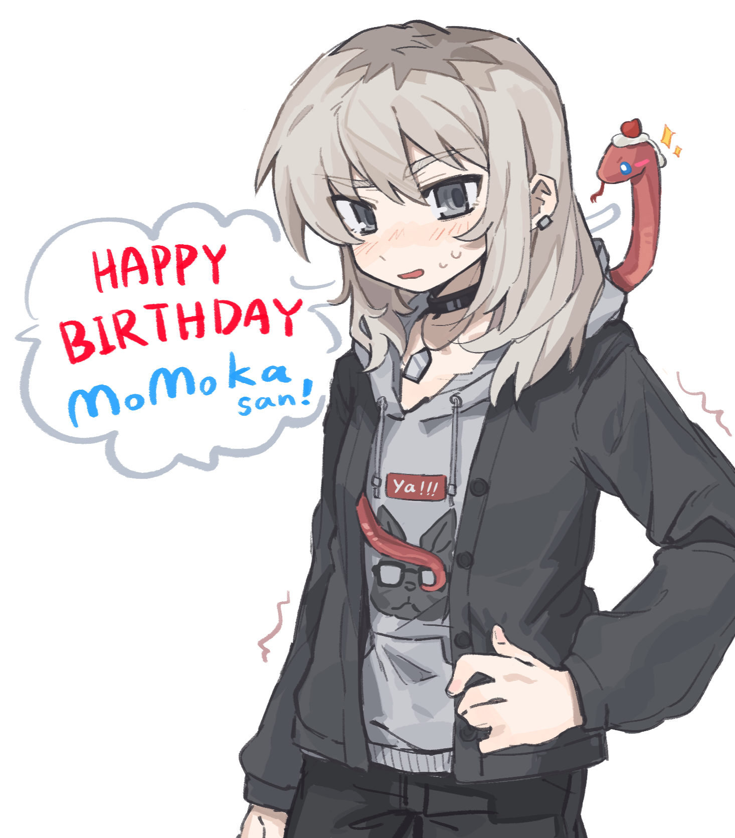 1girlanimalizationblack eyesblue eyeschokercowboy shotgrey hairhappy birthdayjacketjewelrylight blushlong hairnecklaceopen mouthpantssimple backgroundsnakesolosparklesweatdropsweatertremblingwhite background