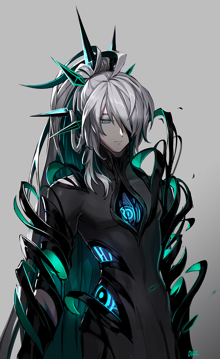 1boyclosed mouthcolored inner haircorecowboy shotdetached armexpressionlessgreen hairgrey backgroundgrey hairhair over one eyehalf-closed eyeshigh ponytailhole in chesthole on bodyhollow bodylong hairlooking downmale focusmulticolored hairponytailringed eyessimple backgroundsolounravelingvery long hair