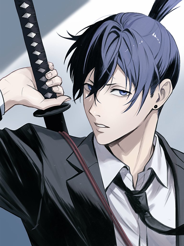 1boyblack necktieblue eyesblue haircollared shirtearringsfingernailshair between eyesjacketjewelrylooking at viewermale focusnecktieshirtshort hairsolosuit jacketteethtopknotupper bodyweaponweapon on backwhite shirt