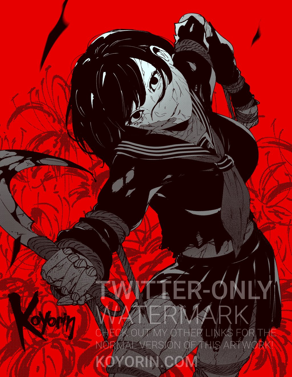 1girlblack eyesblack hairblack serafukublack shirtblack skirtbreastsdoll jointshair between eyesholdingholding weaponjointslarge breastslong hairlooking at viewermidriffmonster girlneckerchiefschool uniformserafukushaded faceshirtskirtsmilesolotorn clothestorn shirttorn skirtunderboobweaponwide hips